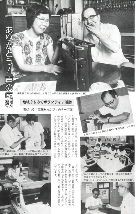 アナウンサーはお知らせを伝えるだけでなく、町内のさまざまなニュースを自ら取材、毎日の放送に地域の人の声をのせることで、有線放送の付加価値を高めていきました。有線放送は地域のラジオとして親しまれ、加入者は放送を依頼するだけでなく、有線放送会館に来て自分で伝えたいことを流すなど町内の人のくらしに浸透していきました。自主制作番組の一環として、昭和55年から「声の広報みっかび」として町の広報誌をアナウンサーが録音、目の不自由な方に役立ててもらうボランティア活動も始まり、大きな反響をもたらしました。