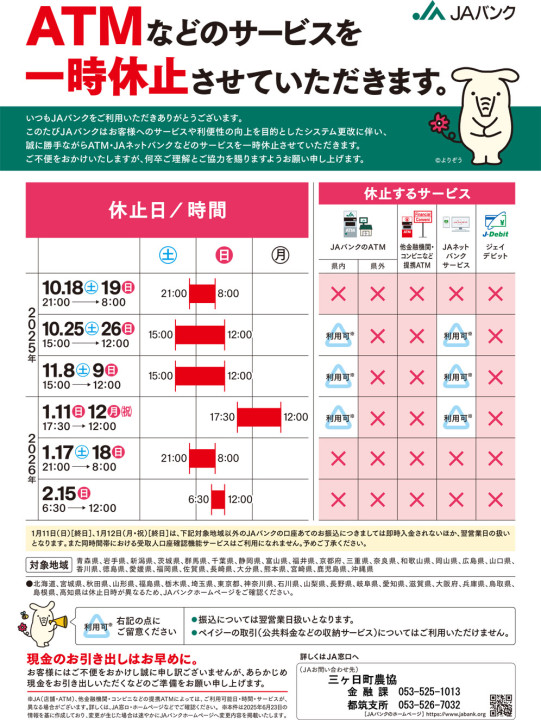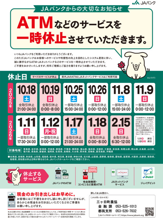 JAバンク ATMなどのサービスの一時休止の事前のお知らせ 2025年10月01日 サービスや利便性の向上を目的としてシステム改修の伴い、ATMやJAネットバンクなどのサービスを一時休止させていただきます。 ご不便おかけいたしますが、何卒ご理解とご協力を賜りますようお願い申し上げます。