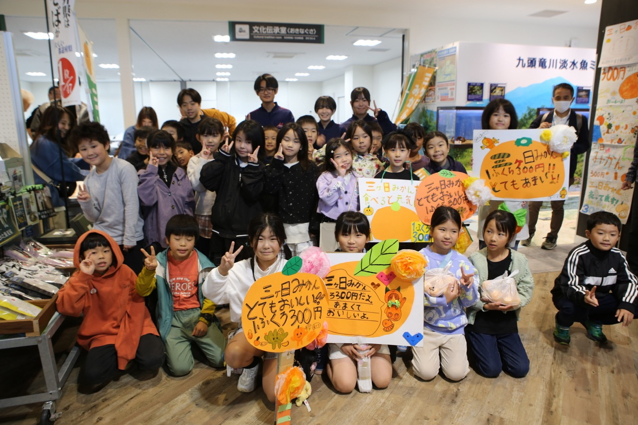 浜松市浜名区三ヶ日町の小中学生約30人が11月8日、特産「三ヶ日みかん」の大使として福井県大野市の道の駅「越前おおの荒島の郷」を訪れ、みかん約500キロを販売しました。子どもたちは元気な声で呼びかけながらPRし、約1時間で完売しました。