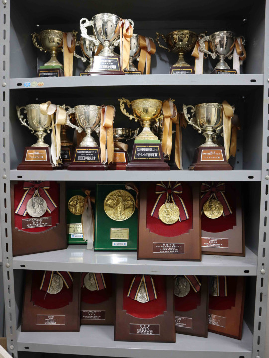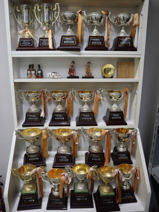 有放会館飾られた歴代受賞した盾やトロフィーの数々