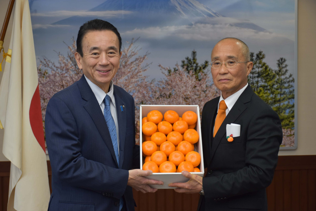 1月15日に行われた第60回静岡県貯蔵ミカン品評会の上位入賞者4人が、28日に静岡県庁の鈴木康友知事らを表敬訪問し、貯蔵ミカンを贈りました。今年は220点の応募の中から最高賞の農林水産大臣賞を髙橋誠さんが受賞。髙橋さんはこれで4度目の農林水産大臣賞受賞となります。今年は外山豊さんが農林水産省農産局長賞、清水德仁さんが農林水産省関東農政局長賞、永田貴彦さんが静岡県知事賞を受賞し、知事らと懇談しました。また、農林水産大臣賞を含む優秀賞上位7席をすべて三ヶ日町の生産者が受賞する快挙を達成しました。