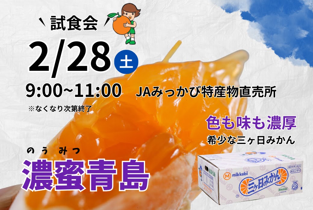 みかん 2/28 9:00~11:00 直売所で濃蜜青島の試食会 2026年02月27日 希少な「濃蜜青島」を味わうチャンス! 普通の青島とは一味ちがう、濃厚な甘みの「濃蜜(のうみつ)青島」。 その名の通り、ギュッと詰まった美味しさをぜひご自身の舌で確かめてみてください! この時期限定の希少な三ヶ日みかんです。 日時: 2/28(土) 9:00〜11:00 場所: JAみっかび 特産物直売所 内容: 濃蜜青島の試食(※無くなり次第終了) 当日は生産者さんも途中参加予定! 越冬完熟ネーブルも入荷