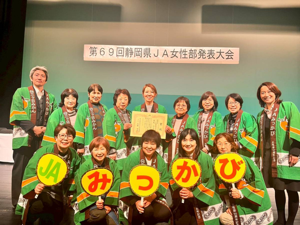 ニュース 静岡県JA女性部発表大会「フレミズの主張」で最優秀賞受賞 2026年03月12日 第69回静岡県JA女性部発表大会が静岡市で開催され、フレッシュミズの主張の部で大福寺の里見ひとみさんが「なりたい自分に私はなる!」と題して発表、子育てや農業に前向きに取り組む日々を伝え、見事に最優秀賞を獲得しました。発表で里見さんは「子供たちが『この土地に生まれ育って良かった』と誇りを持って言えるような地域づくりに励みたい」と決意を述べました。 応援に駆け付けた女性部正副部長や女性部員たちと里見さん(中央)