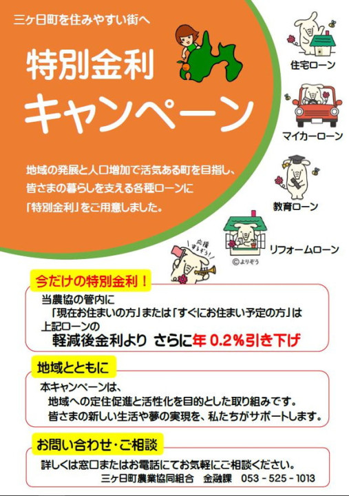 JAバンク 三ヶ日町を住みやすい街へ特別金利キャンペーン 2026年04月07日 金融課では三ヶ日町の活性化等を目指し、住宅ローン・マイカーローン・教育ローン・リフォームローンを特別金利で紹介しています。詳しくは金融課窓口またはお電話での問い合わせをお待ちしております。
